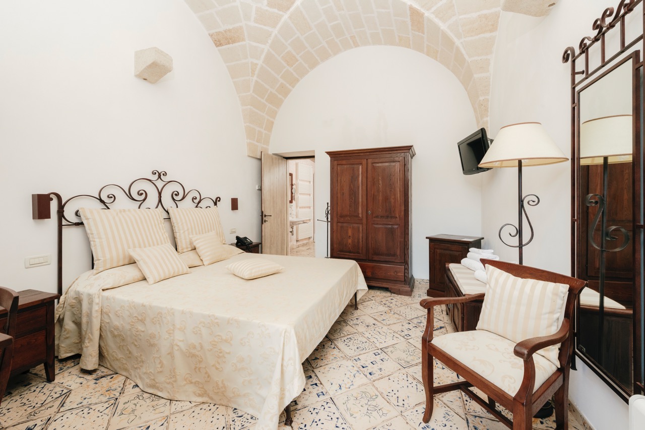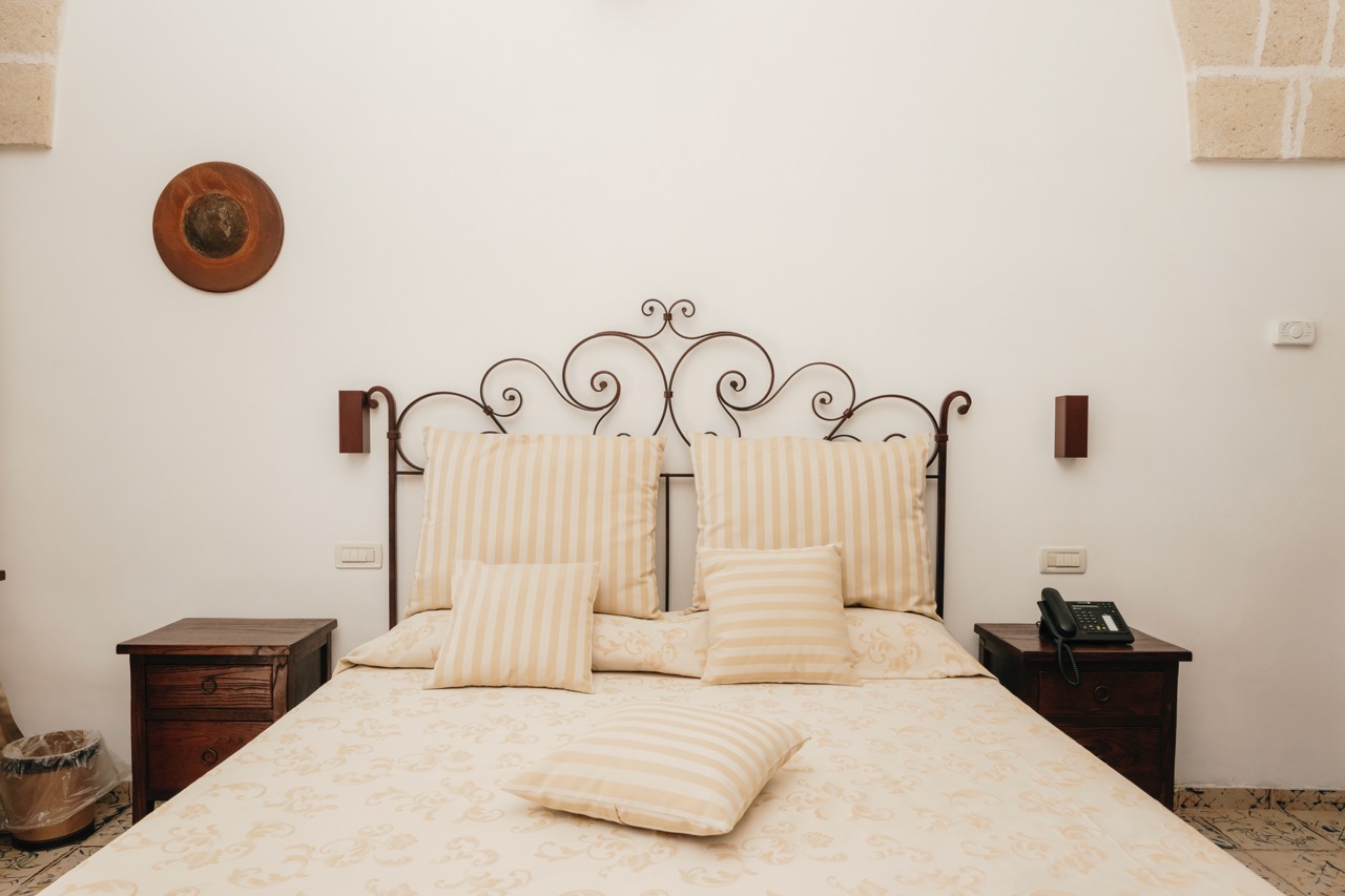Le Camere Standard di Masseria Strazzati accolgono con uno stile semplice e autentico, fedele alla natura più sincera della masseria. Pavimenti decorati, pareti in pietra e arredi essenziali creano un ambiente intimo, dove ogni dettaglio richiama la tradizione rurale. L’affaccio sul portico o sugli spazi interni contribuisce a un’atmosfera di quiete profonda, perfetta per chi cerca un soggiorno rilassante in un luogo dal ritmo lento e rigenerante.