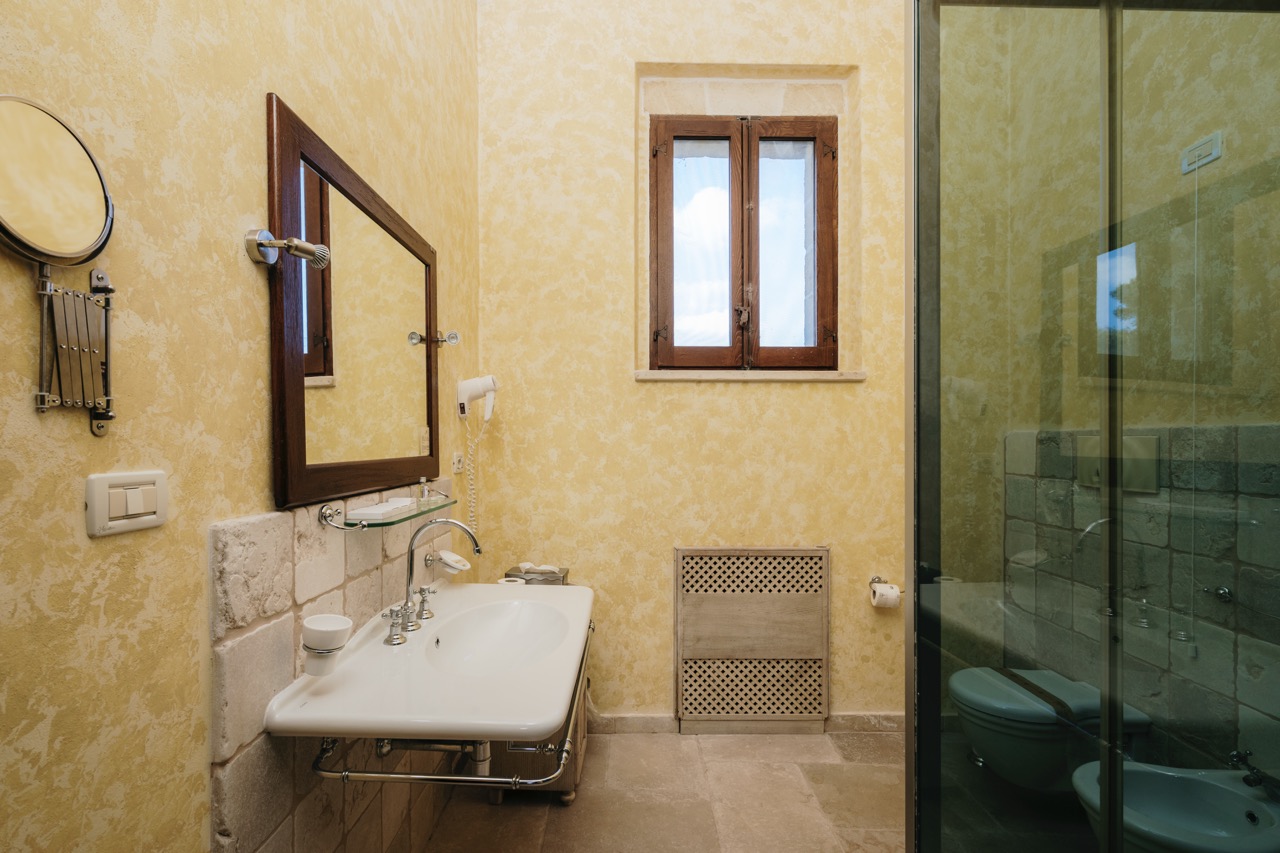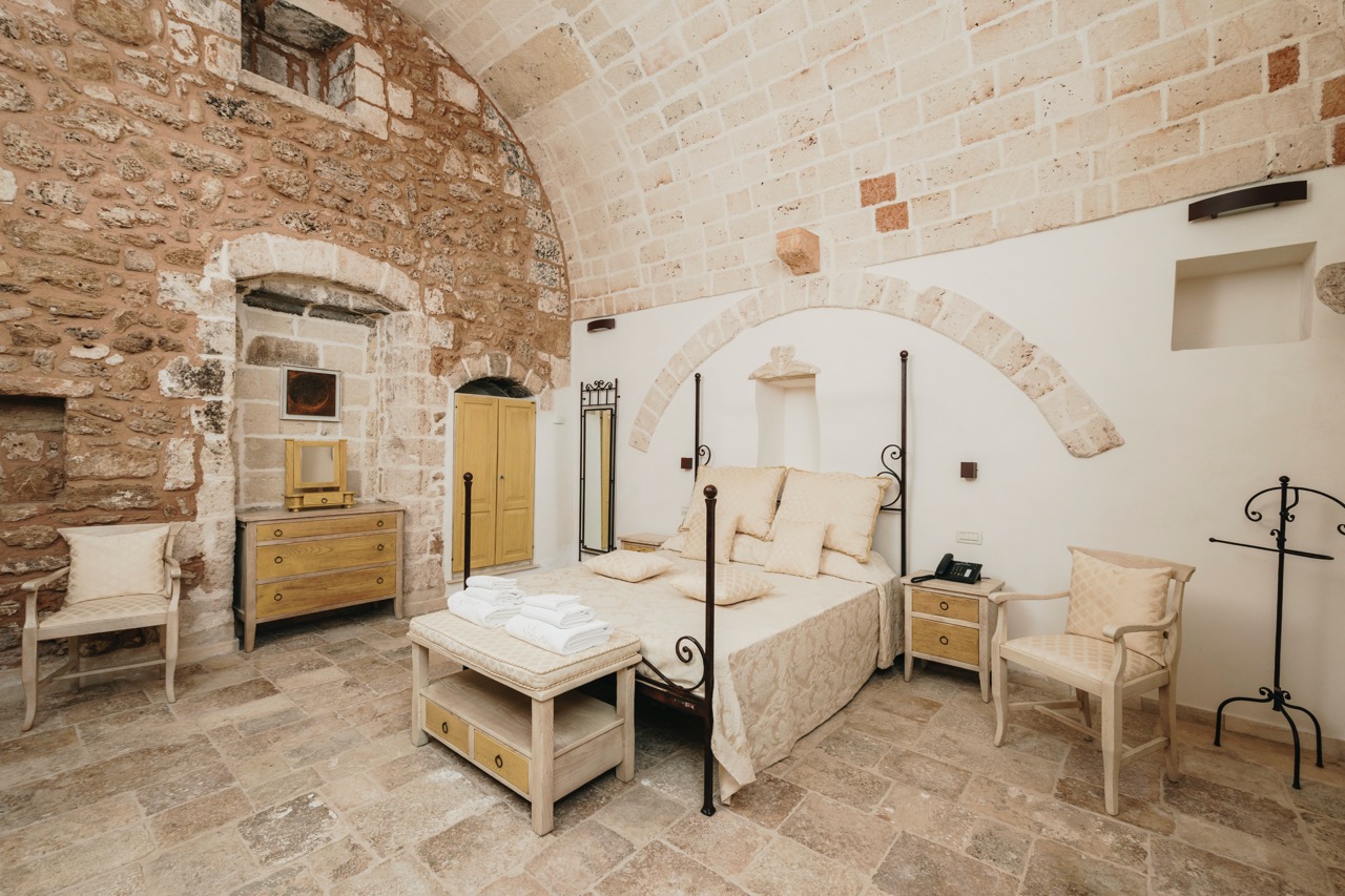La Suite Strazzati è l’ambiente più distintivo della masseria: due spazi ampi e armoniosi, collegati tra loro, che combinano autenticità rurale ed eleganza essenziale. L’arredo tradizionale si unisce alla morbidezza dei colori naturali, creando un ambiente ricco di atmosfera. Il piccolo balcone, presente in alcune sistemazioni al primo piano, offre un punto privilegiato da cui osservare il silenzio della campagna. È la camera ideale per chi desidera un soggiorno raccolto, familiare e profondamente legato al ritmo lento di questo luogo.