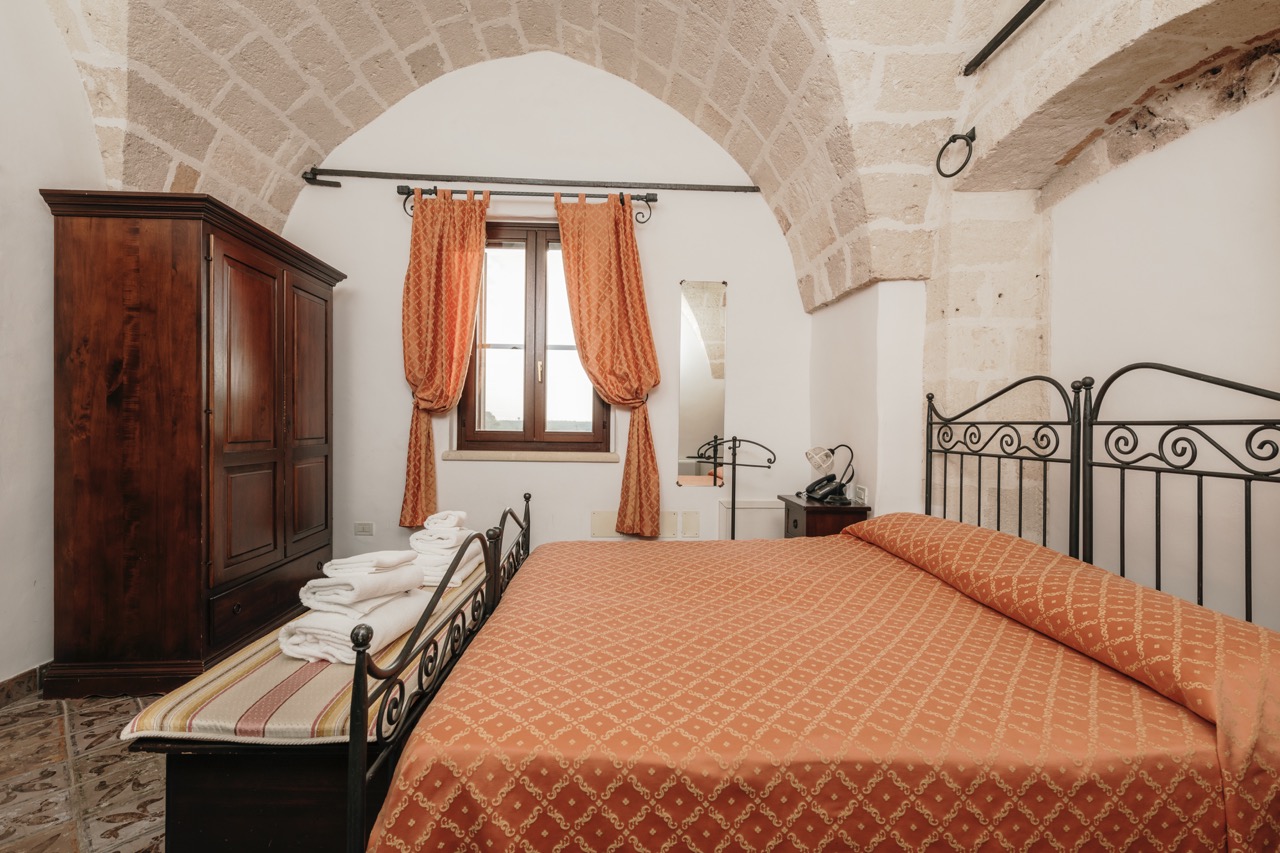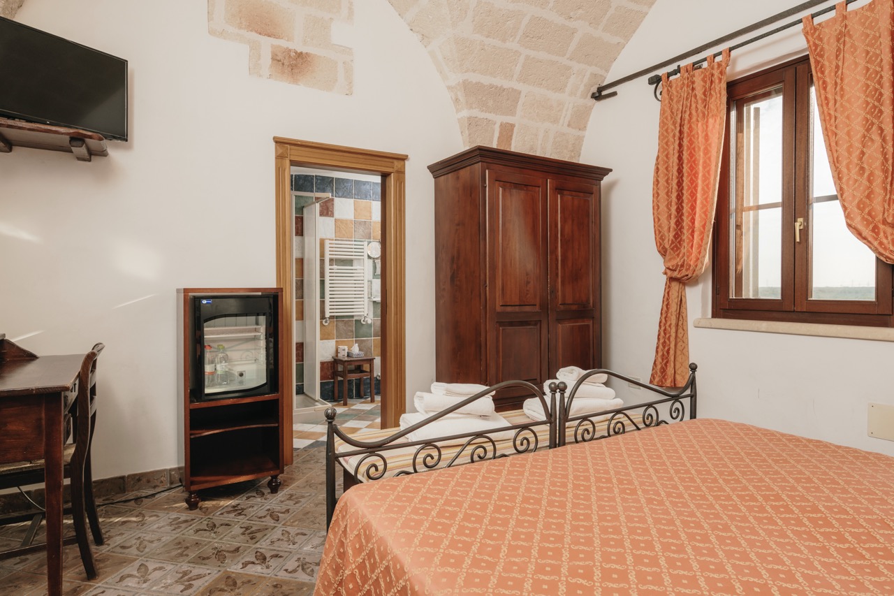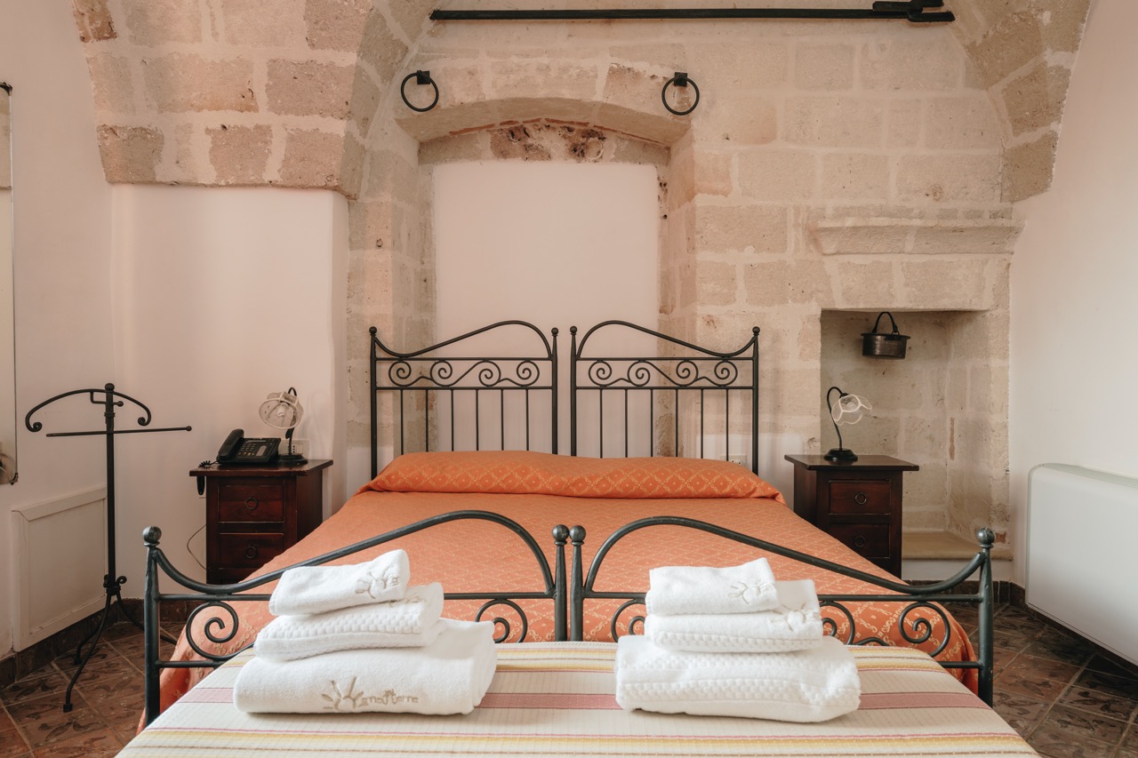 Cosy and intimate, the Standard Rooms embody the most authentic essence of the masseria. Featuring exposed stone, wrought-iron beds and period furnishings, they reflect the elegant simplicity of Apulian tradition. Some overlook the olive grove, others the inner courtyard, offering glimpses of absolute tranquillity. They are the ideal choice for guests seeking an essential yet atmospheric stay, immersed in the quiet of the countryside.
